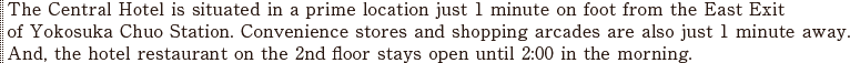 from Yokohama Station by Limited Express Train. The Central Hotel is 1 minute